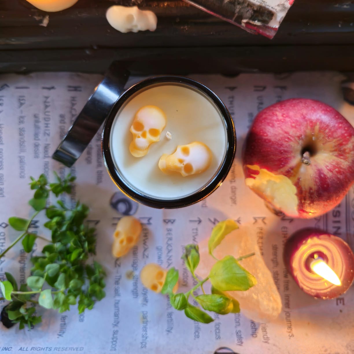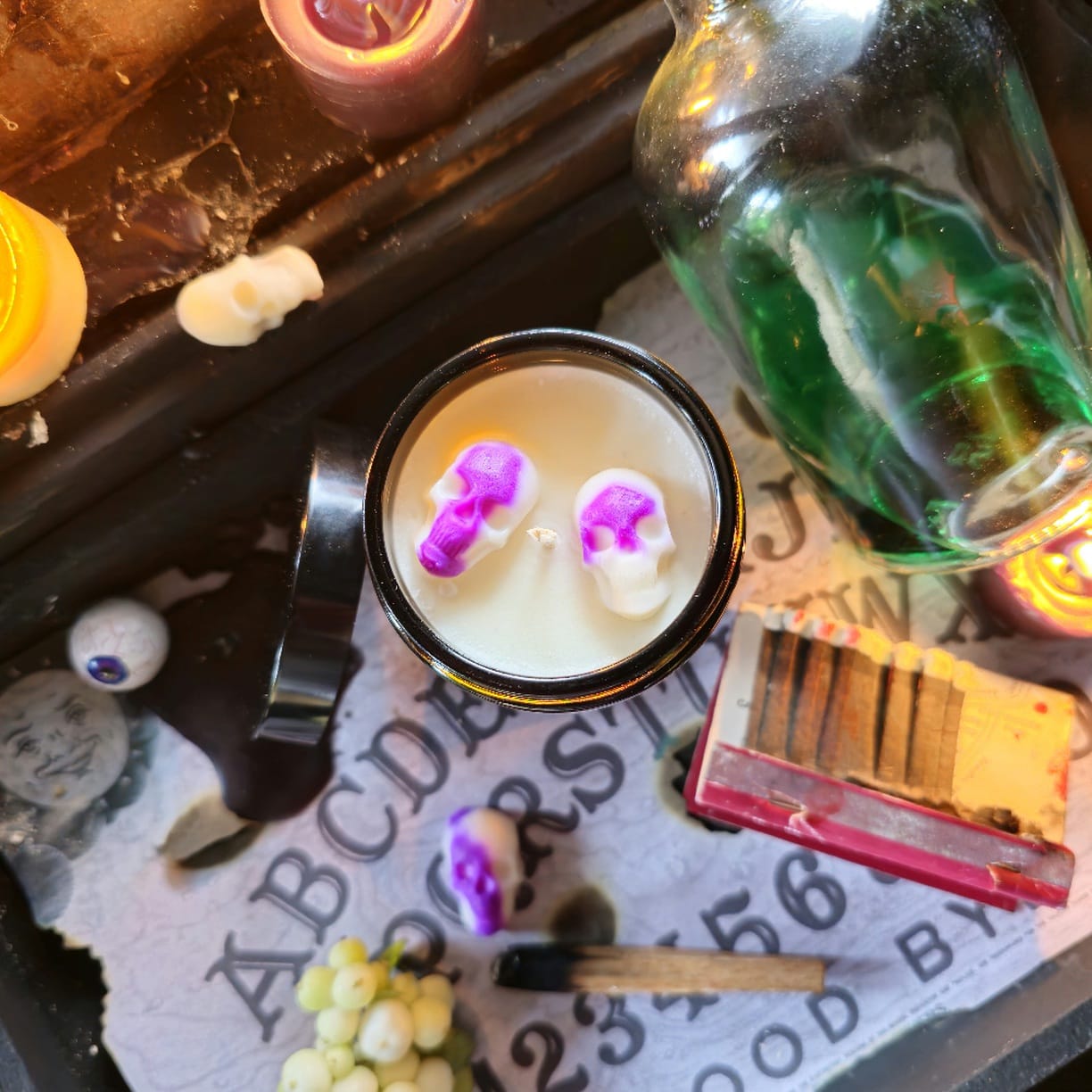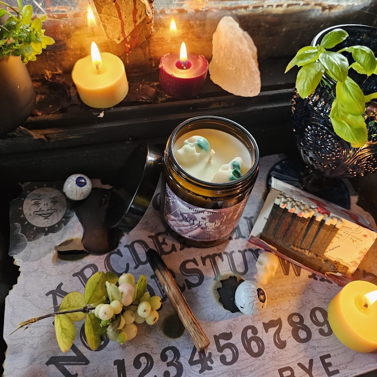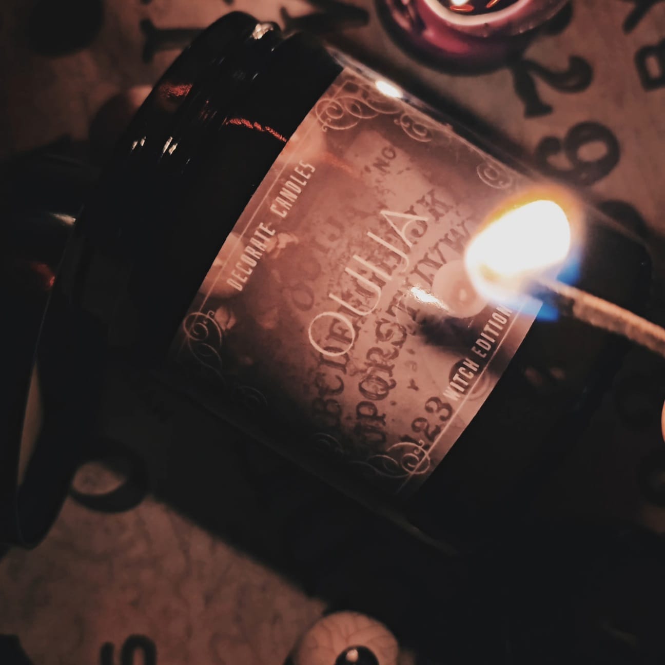 The Halloween candle “Ouija” is an extraordinary fragrance mixture that evokes associations with supernatural phenomena and mystery. You can feel the intense aroma of leather, which adds a note of dark elegance. Oud, the precious and deep scent of agarwood, gives the composition sensuality and mystery. Pink pepper adds a slightly spicier note, while incense brings a smoky, mystical atmosphere to the composition. Ylang-ylang adds notes of sweetness and exoticism, creating a contrast with elements of smoke and fear. The entire composition creates an extraordinary, mysterious atmosphere, perfect for Halloween.