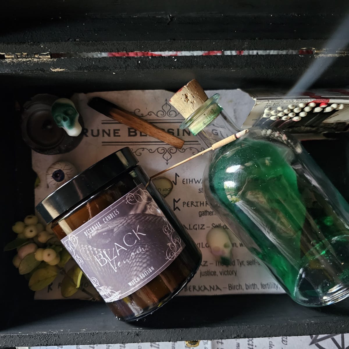 The Black Venom Halloween candle is a real explosion of a mysterious and enchanting aroma that will take you to another dimension. Notes of incense envelop you in their mystical smoke, while the scent of pomelo and dragon fruit adds a tropical and exotic note. Vanilla and amber add warmth and sweetness, while patchouli and dragon blood add depth and power to the scent. The entire mixture creates a fragrance that is intriguing, enchanted and slightly dangerous at the same time, perfect for candlelight evenings during Halloween.
