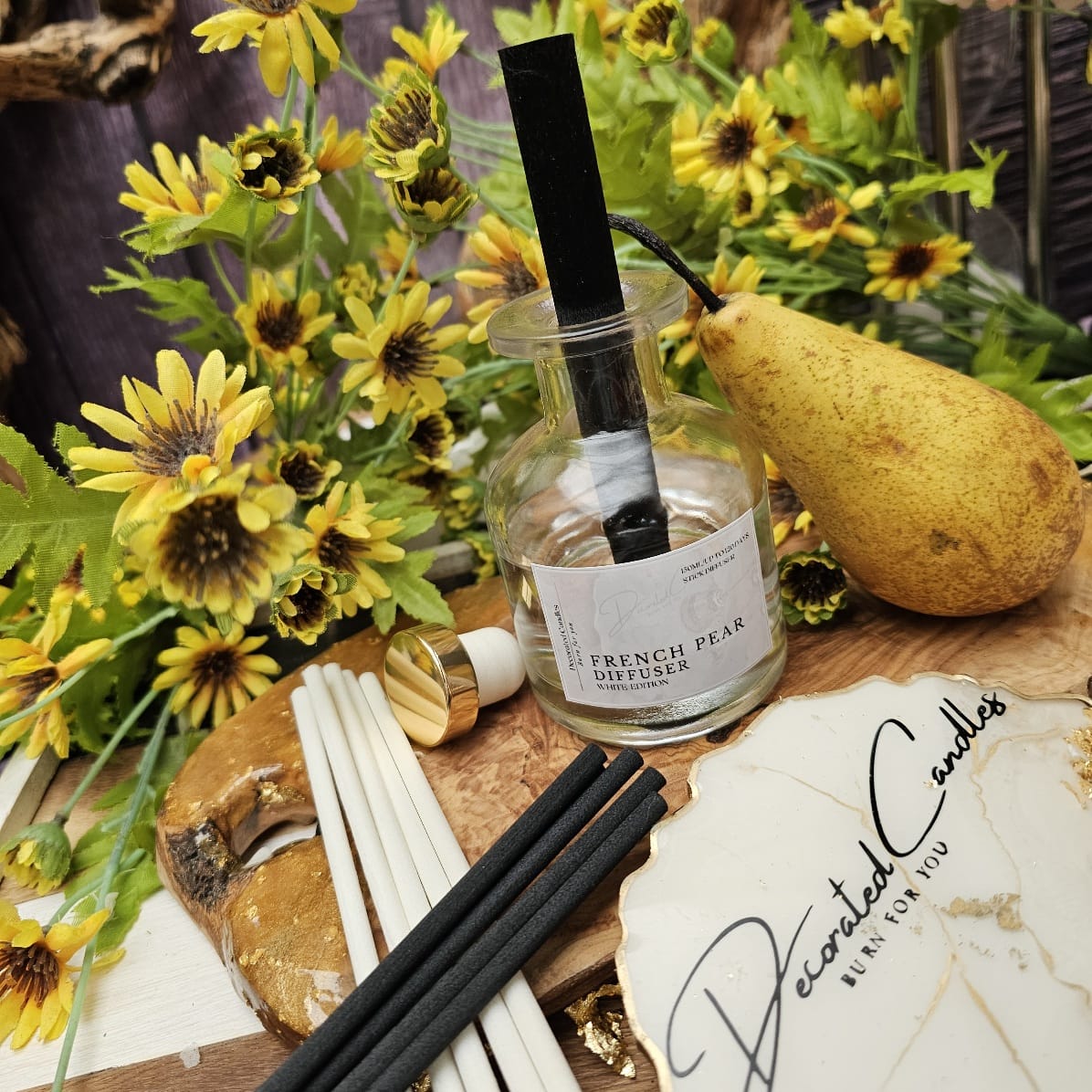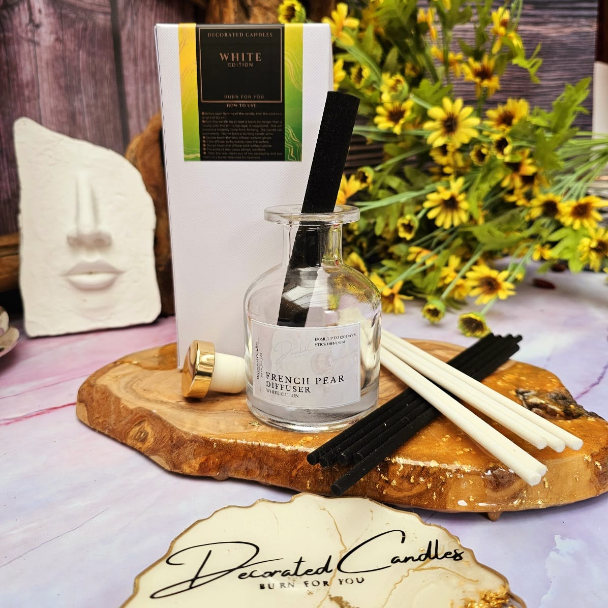 The “French Pear” diffuser  is an exquisite fragrance mixture that takes us on a sensual journey through French orchards. Its fragrance notes consist of juicy green pear combined with the aroma of sweet brown sugar, which gives it a delicate freshness combined with a distinct sweet scent. In its heart, there are notes of cloves and coconut, which add depth,creating a sensual and intriguing aromatic bouquet. The base of the candle contains notes of orange and mint, which gives the diffuser a subtle, refreshing aroma, making the entire composition balanced and harmonious. It is a perfect choice for lovers of delicate, fruity scents who want to surround themselves with pleasant, relaxing aromas in their own homes.
