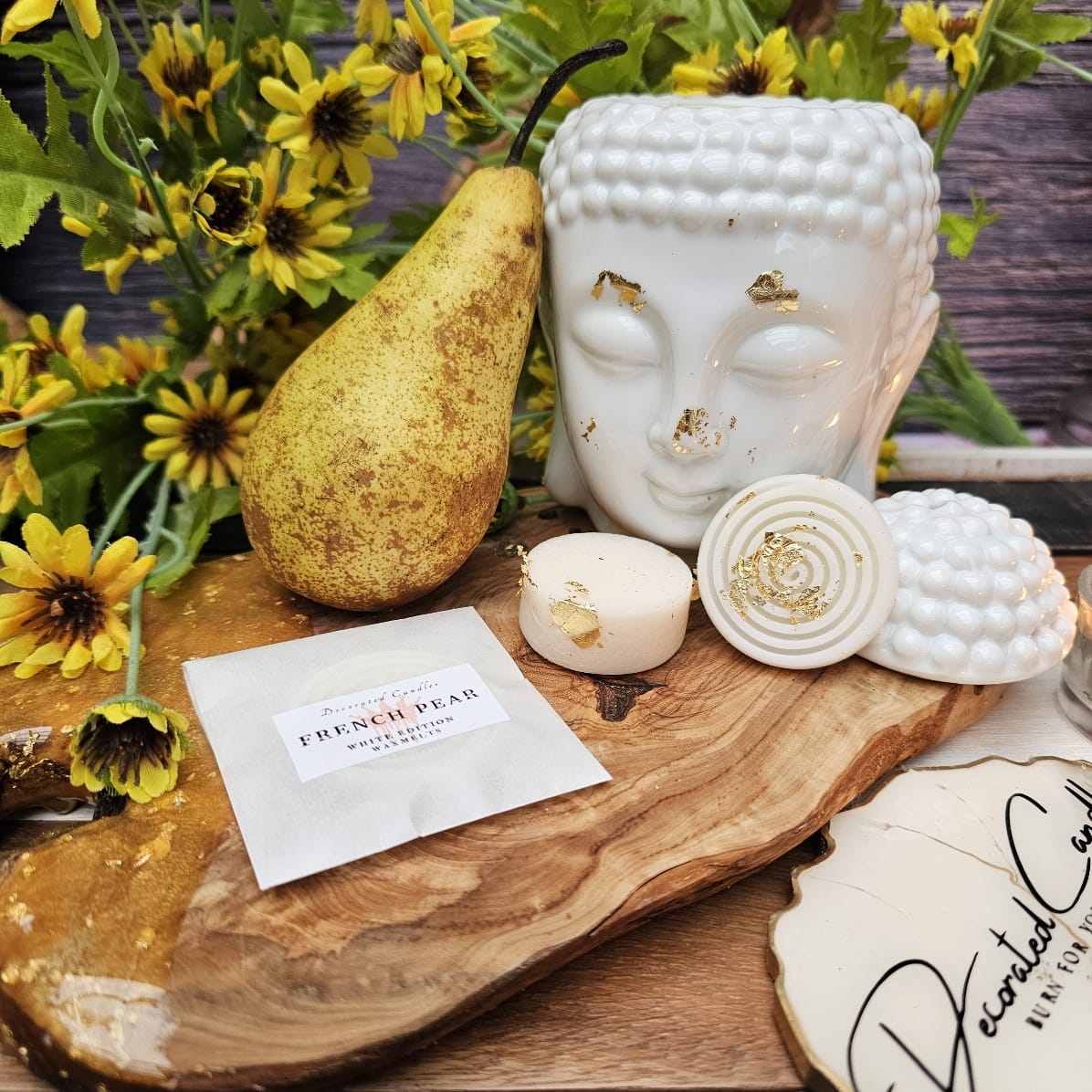 The “French Pear” waxmelts are an exquisite fragrance mixture that takes us on a sensual journey through French orchards .Its fragrance notes consist of juicy green pear combined with the aroma of sweet brown sugar, which gives it a delicate freshness combined with a distinct sweet scent. In its heart, there are notes of cloves and coconut, which add depth, creating a sensual and intriguing aromatic bouquet. The base of the waxmelts contains notes of orange and mint,which gives the waxmelts a subtle, refreshing aroma, making the entire composition balanced and harmonious.It is a perfect choice for lovers of delicate, fruity scents who want to surround themselves with pleasant,relaxing aromas in their own homes.