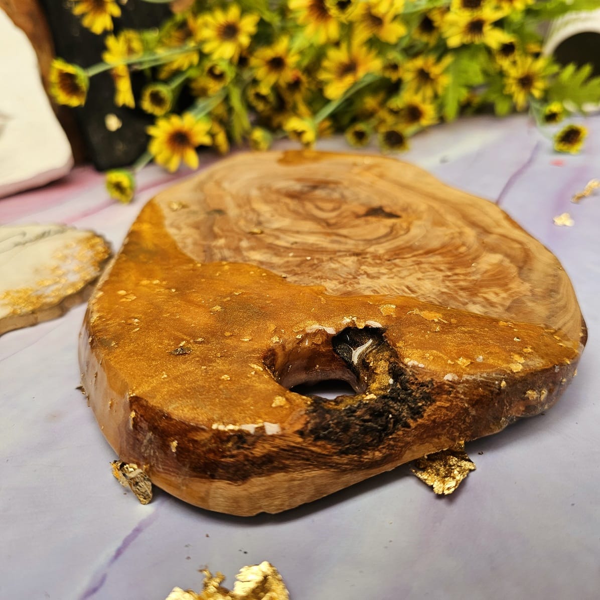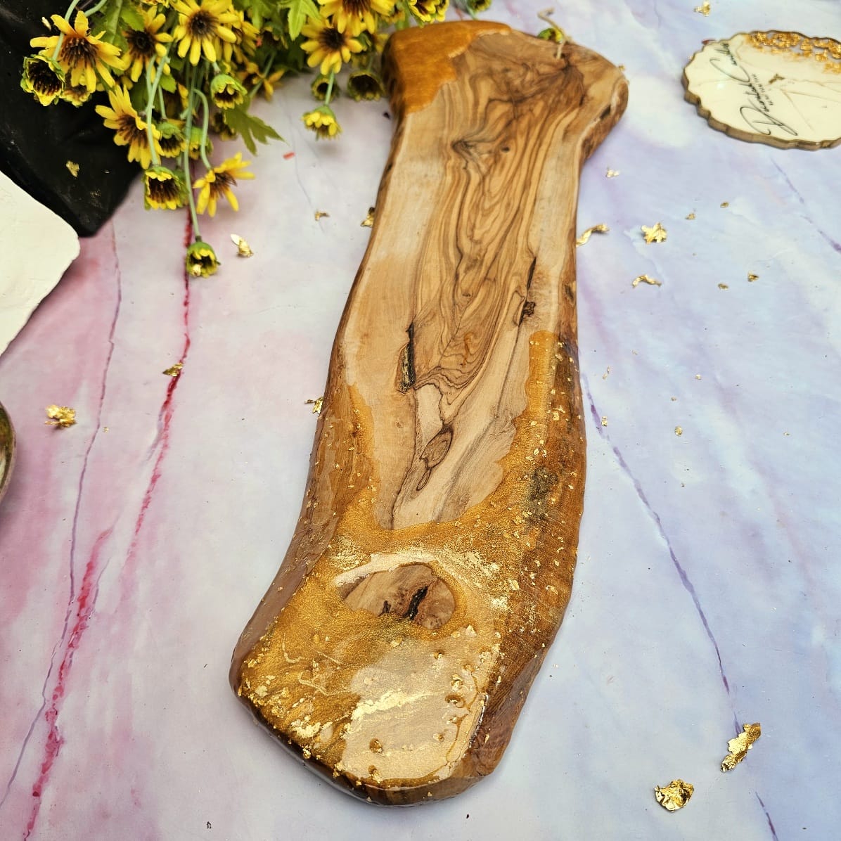An unusual “Wood and Resin” board made of beautiful olive wood and decorated with resin. This is a large, handmade board that can be a perfect decoration for your home, as well as a practical accessory for serving snacks. It can also be used as a candle holder or diffuser. The board is not only functional, but also aesthetic and fits perfectly into various interior styles. A perfect gift idea for people who value original and unique items.